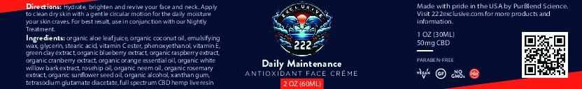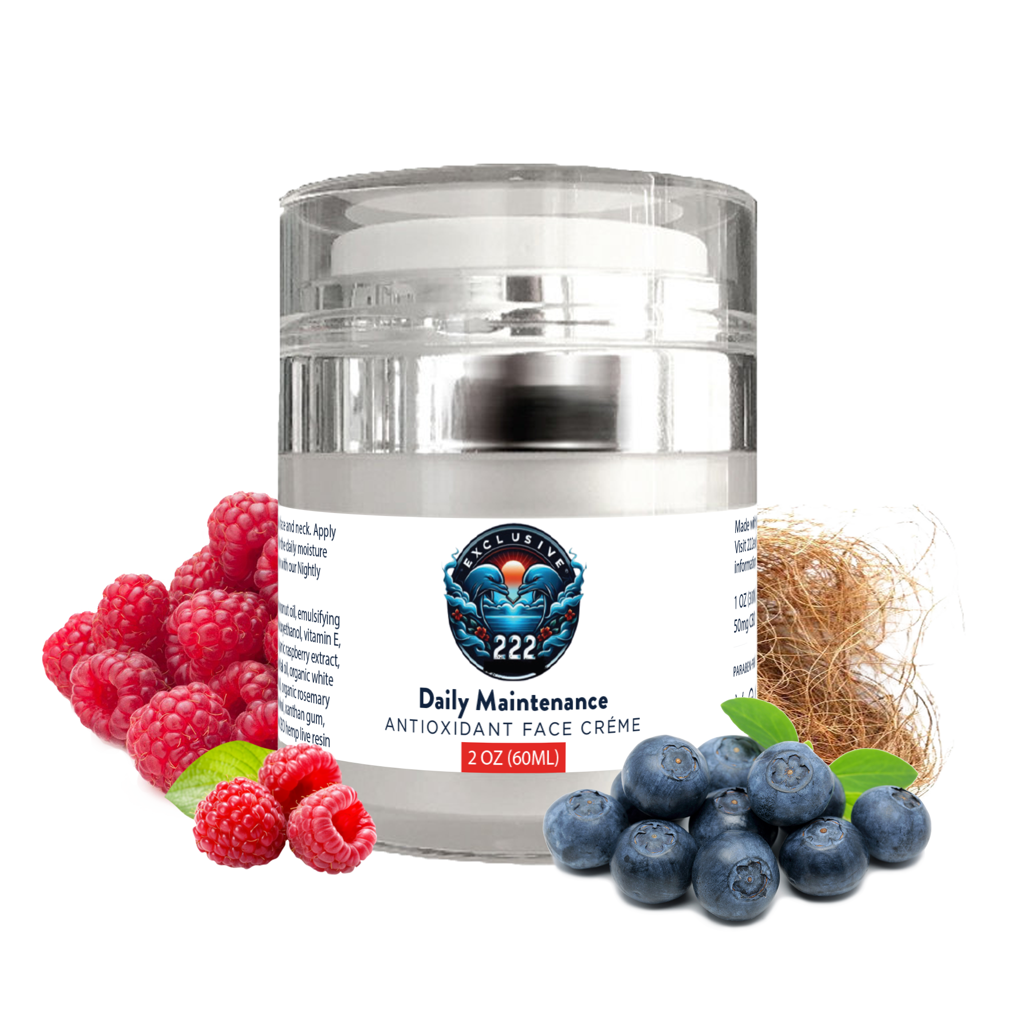 222 Exclusive’s series of facial and body skin treatments introduce Vitamin C Facial Maintenance. A rich, yet easily absorbable facial crème perfect for mature skin delivering high concentrations of valuable vitamin C esters directly to the skin providing support & balance. Accented with organic sweet orange essential oil this antioxidant‐rich crème features organic blueberry, raspberry and cranberry extracts, with omega 3 & 6 enriched rosehip oil, clarifying white willow bark, full spectrum hemp resin and more, all combine to create a gentle, yet effective daily use crème.
